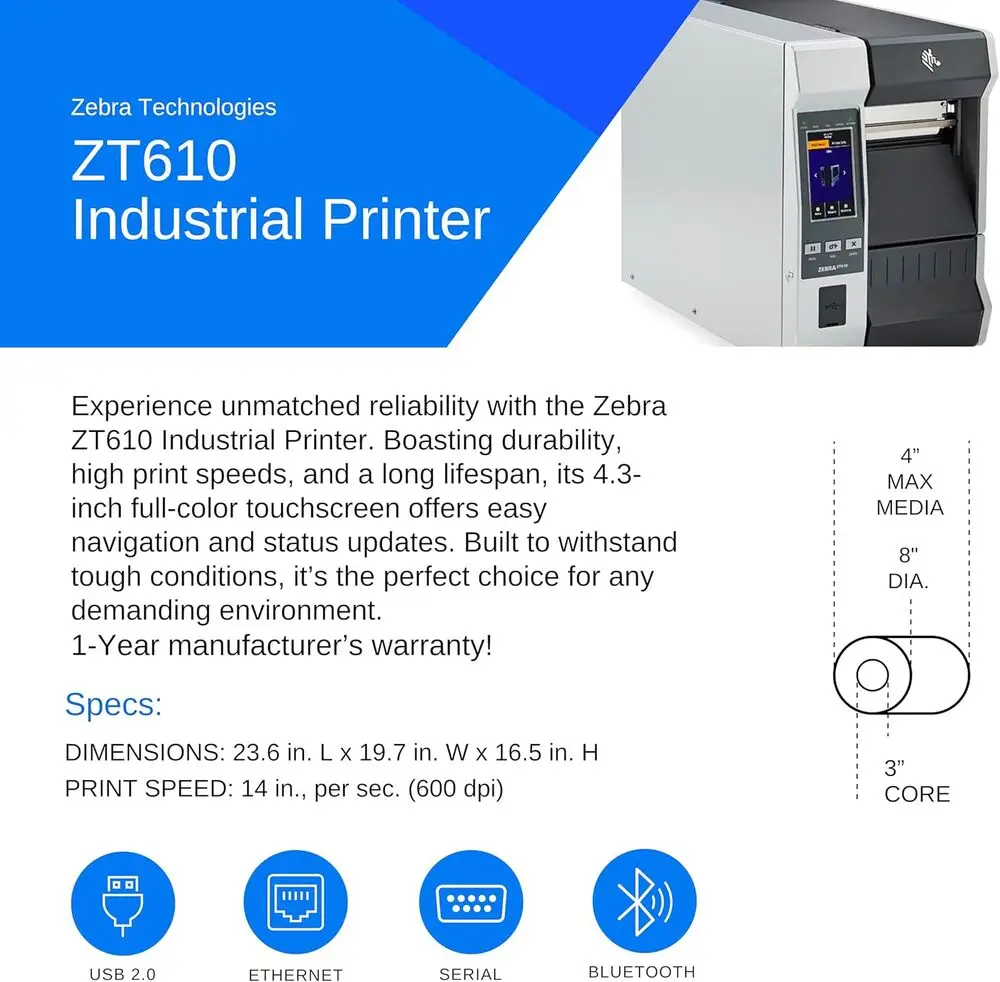 The Zebra Technologies ZT62063-T010100Z is a high-performance industrial label printer designed for demanding office environments requiring reliable barcode printing solutions. It features advanced precision thermal transfer and direct thermal printing technologies to ensure sharp, durable labels. Engineered for fast throughput, it supports print speeds up to 14 inches per second with resolutions that range from 203 to 600 dpi. The device incorporates a robust metal frame and large, color touchscreen interface to simplify user operations and maintenance tasks. Its connectivity options include USB, Ethernet, and serial interfaces, facilitating seamless integration into various office automation systems. The printer supports an extensive range of media types and sizes, allowing flexible label customization for diverse applications.