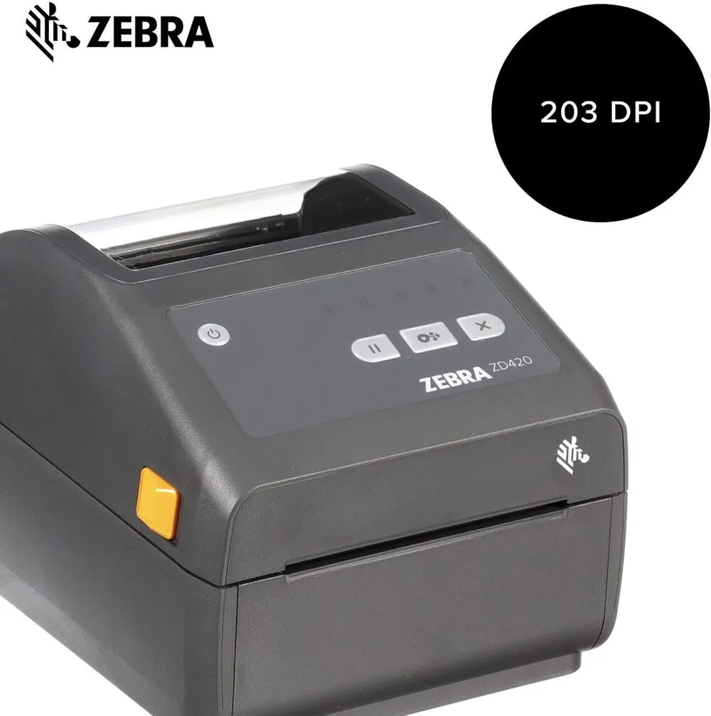 The Zebra ZD420d is a direct thermal desktop printer known for its compact design and user-friendly features suitable for office electronics and professional printing. It supports fast print speeds up to 6 ips, delivering efficient label and tag printing. Equipped with USB, Ethernet, and optional wireless connectivity, it integrates well into various network environments. Its 203 dpi resolution ensures clear, crisp printing ideal for barcode labels, receipts, and tags. The printer features easy media loading through a clamshell design and supports multiple label widths up to 4.09 inches. Additionally, the ZD420d operates on the Link-OS platform, allowing for advanced management and remote diagnostics.