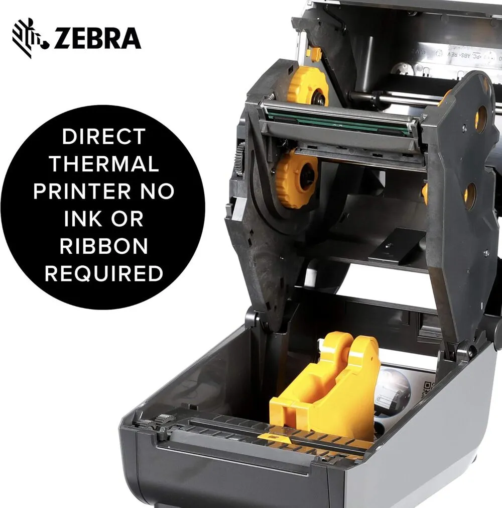 The Zebra ZD620d uses direct thermal printing technology, which prints labels by applying heat to specially coated thermal paper, eliminating the need for ink or ribbon.