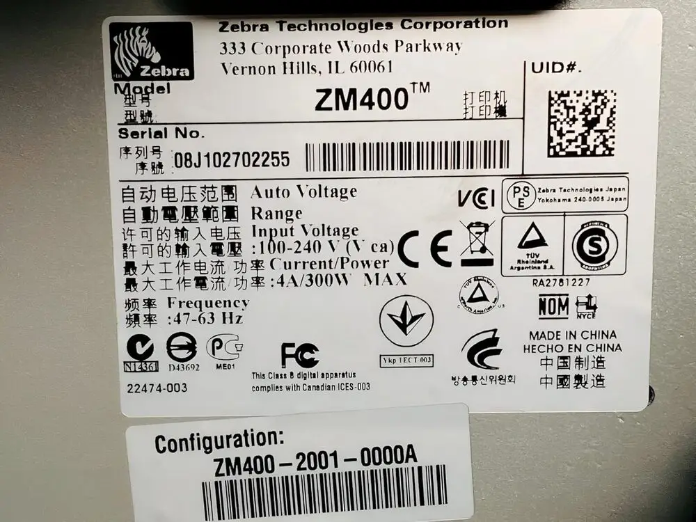 The Zebra ZM400 is a high-performance industrial barcode printer designed for heavy-duty printing environments. It offers both thermal transfer and direct thermal printing technologies, supporting labels up to 4.09 inches in width. The printer supports fast print speeds up to 10 inches per second, enabling efficient handling of large volume printing tasks. It features a 32-bit RISC processor with 4MB Flash memory and 8MB SDRAM for processing complex label formats and graphics. Connectivity options include serial, parallel, and USB ports for versatile integration. Additionally, the ZM400 supports multiple printer languages such as EPL and ZPL, providing broad compatibility with existing systems.