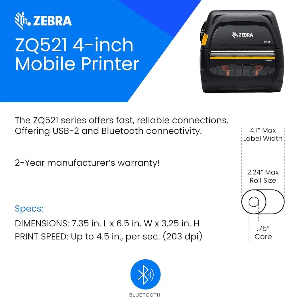 The Zebra ZQ521 Bluetooth is a mobile label and receipt printer designed for office and field applications. It supports wireless Bluetooth connectivity ensuring fast and reliable data transmission between devices, ideal for mobile printing needs. The printer features a high-resolution print head with a thermal printing mechanism, enabling crisp and clear output without ink. Its compact design integrates rugged construction materials, providing durability in various environments. The device supports multiple media widths and is compatible with a range of label and receipt types. An embedded battery management system allows for extended usage during mobile or off-grid operation.