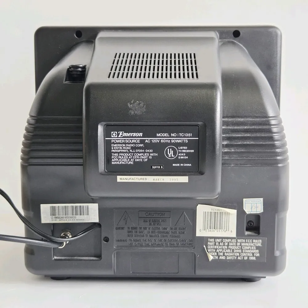 The Emerson TC1351 is a CRT television that features a traditional cathode ray tube display technology, common in the mid-1990s. It supports standard definition video resolution and analog signal input via RF and composite connectors. The device incorporates a manual tuning system alongside rotary control knobs for channel and volume adjustment. The power consumption aligns with CRT characteristics, typically higher than modern flat-panel displays. Its chassis is designed to house internal circuitry including the tuner, CRT, and audio amplifier components. The Emerson TC1351 is suitable for receiving over-the-air broadcast signals and basic AV input, representative of TV sets before the digital transition era.