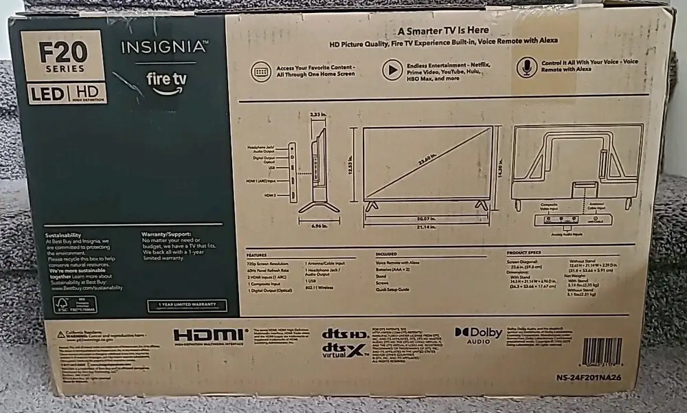 The NS-24F201NA26 offers easy setup and user-friendly on-screen menus catered to all user levels. Its LED backlight technology provides better contrast and energy efficiency compared to older LCD models. The inclusion of multiple HDMI ports enables connection to modern digital devices without the need for adapters. Despite its small size, the TV delivers consistent image quality with decent viewing angles. The built-in tuner eliminates extra costs for external boxes for over-the-air programming. Additionally, its lightweight design makes it portable and easy to mount on walls or place on stands, increasing placement flexibility.