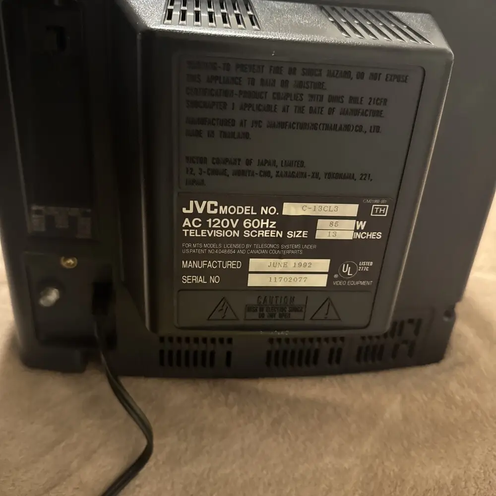 The JVC C-13CL3 is a vintage television that integrates CRT display technology typical of the mid-1980s. It features an analog tuner compatible with VHF/UHF channels, delivering standard definition picture quality. Equipped with manual rotary dials for channel selection and volume control, it relies on cathode ray tube imaging technology for video display. The television supports mono audio output through a built-in speaker. Connectivity options include aerial input for antenna reception, and limited analog audio/video inputs. Its construction incorporates a robust chassis with a plastic and metal cabinet, designed for durability in domestic use.