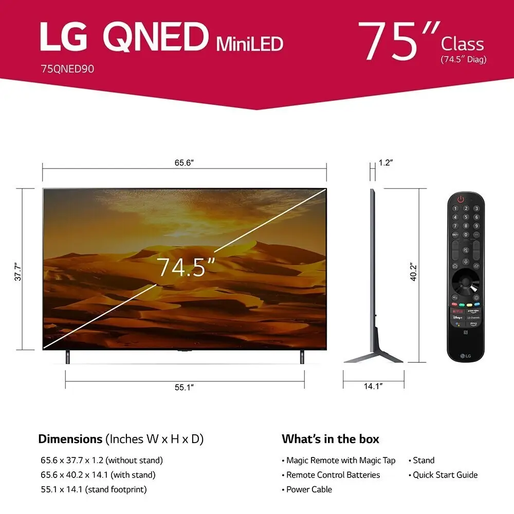 The LG 75QNED90UQA uses QNED Mini LED technology that combines Quantum Dot and NanoCell technologies with miniaturized LED backlighting for improved brightness and color accuracy.