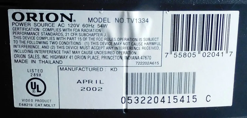 The Orion TV1334 is a CRT-based television model designed primarily for standard definition display technology. It integrates analog signal processing typical of the early 2000s with composite and RF input options for compatibility with traditional broadcast sources. The television features a 13-inch screen size with a 4:3 aspect ratio, delivering a resolution standard for its time. The chassis is compact, incorporating built-in stereo speakers and manual control knobs alongside remote operation. The electronic circuitry supports NTSC video standards, ensuring compatibility with North American broadcasting systems. Power supply is designed for typical household AC voltage with energy consumption suited to CRT technology benchmarks.