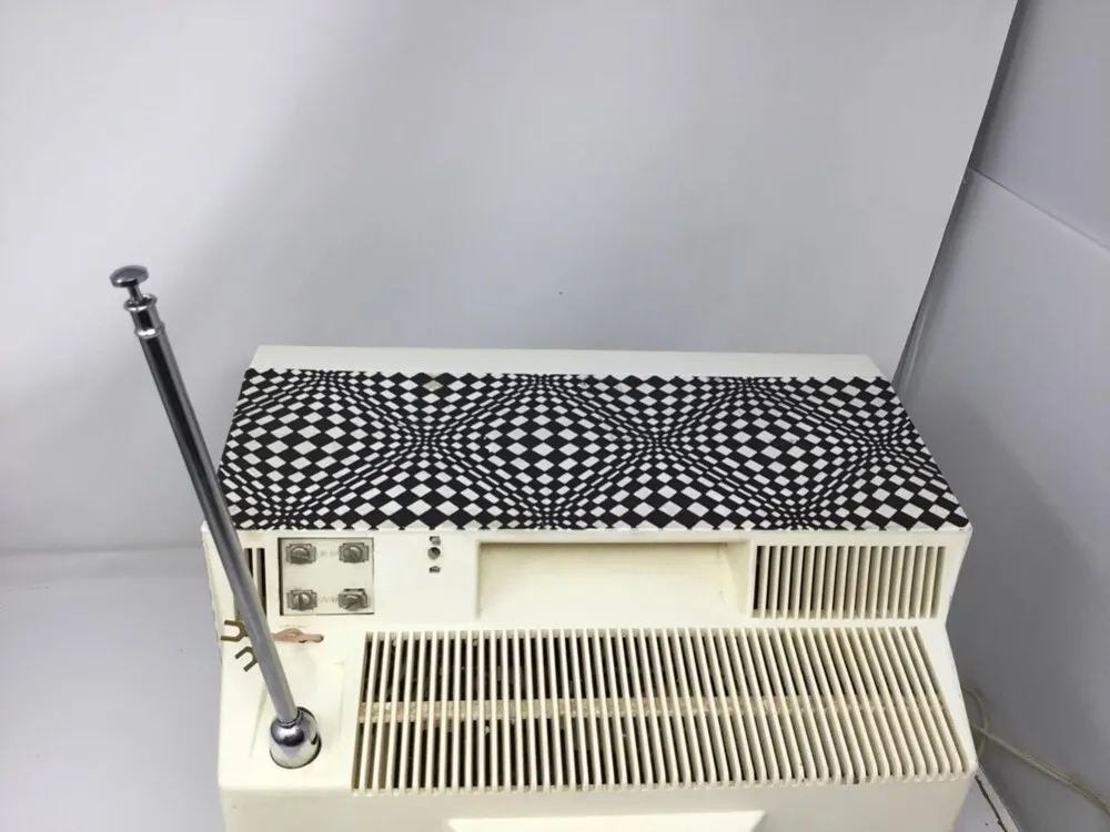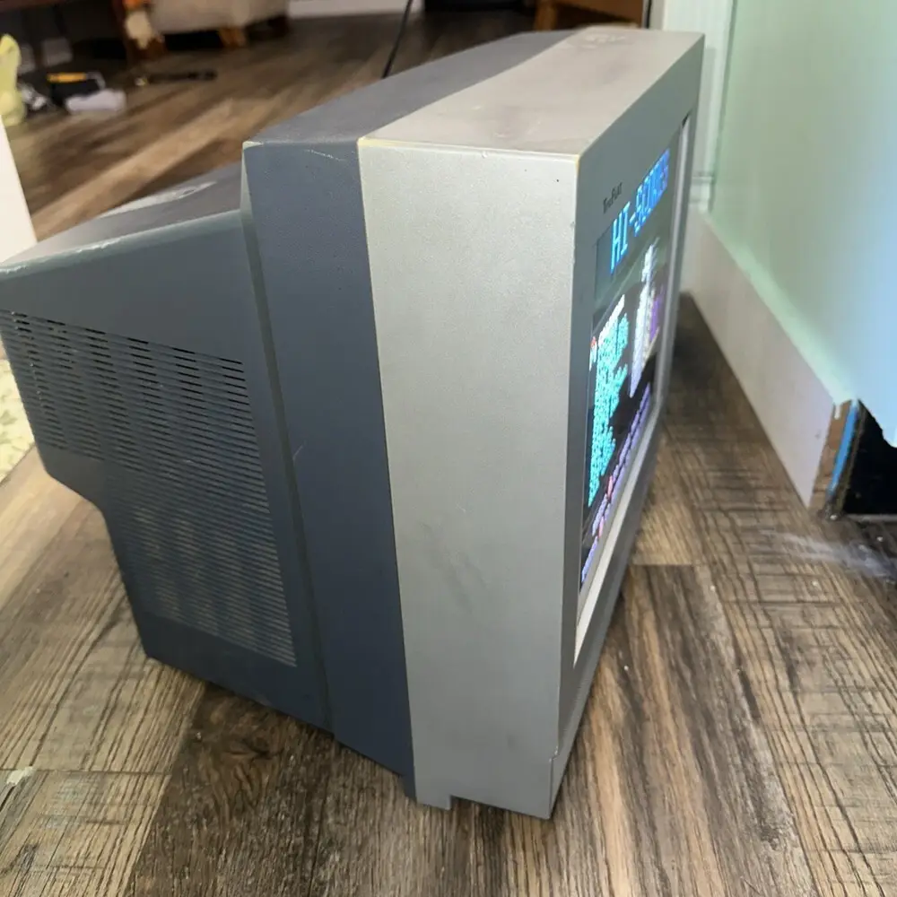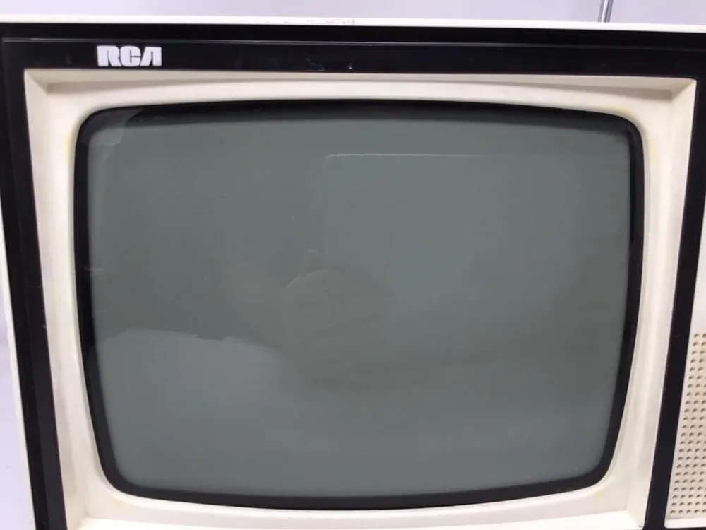 The RCA Truflat 14 uses a flat CRT screen designed to reduce glare compared to traditional curved CRT screens.
