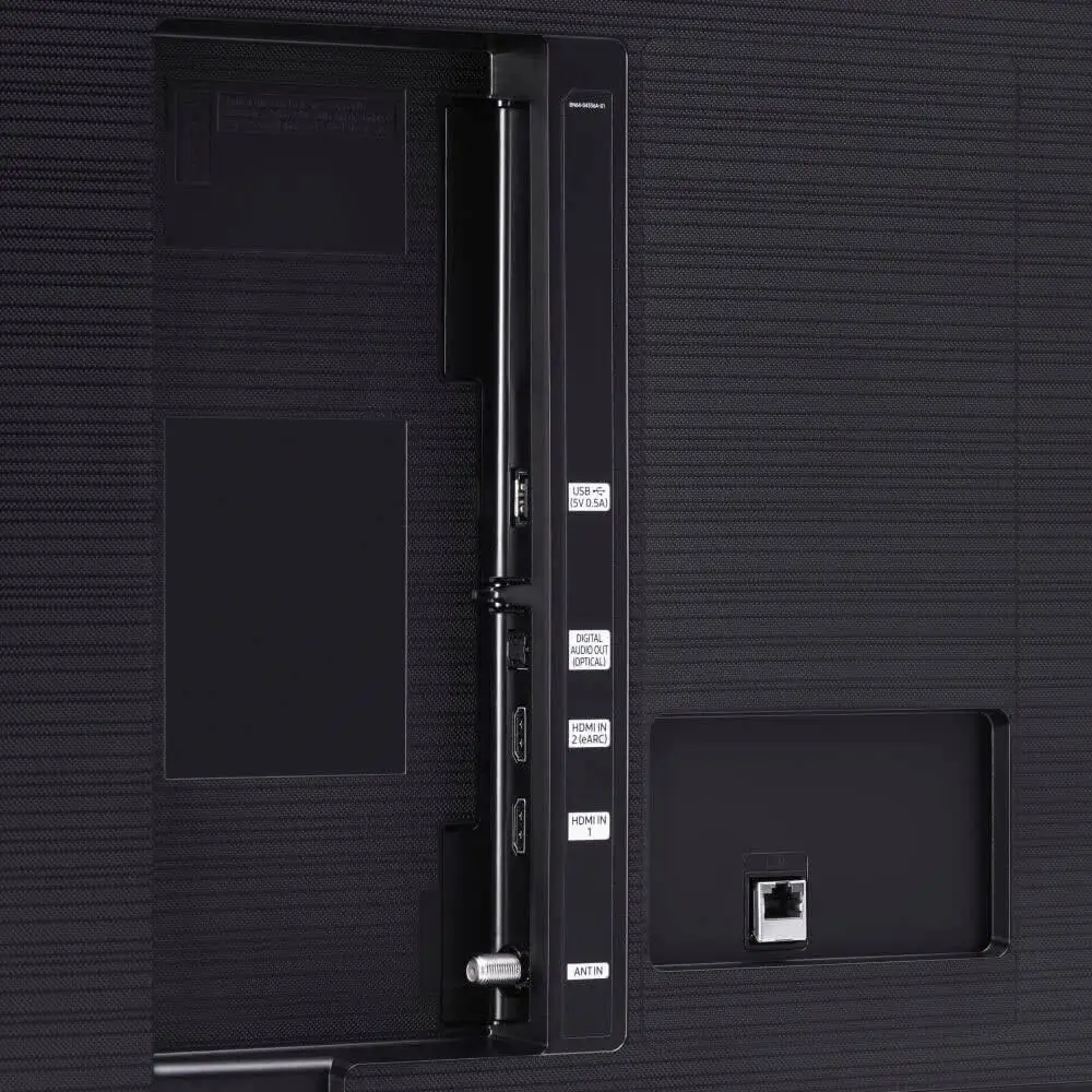 Connectivity options include multiple HDMI ports and USB inputs, allowing connection of external devices such as gaming consoles and USB drives. The TV runs on Tizen OS, enabling smart features like app downloads, streaming services, and voice control compatibility.