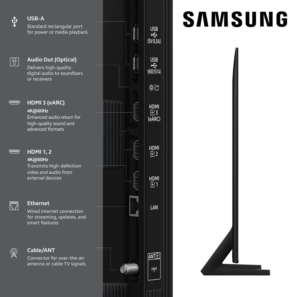 The TV runs on Samsung's Tizen OS providing access to Smart Hub, popular streaming apps, voice assistants, and screen mirroring.