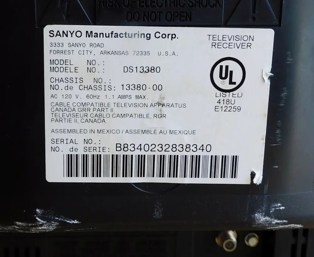 The SANYO DS13380 is a CRT-based television set released in the late 1990s. It features an analog tuner compatible with NTSC broadcast standards prevalent at the time. The DS13380 utilizes a cathode ray tube for image display, providing standard definition resolution typical for its era. Connectivity options include composite video inputs allowing connections with VCRs and gaming consoles of the period. The unit is designed with manual controls and offers basic on-screen display functionality. The power consumption aligns with CRT technology norms, and the chassis supports a moderate screen size roughly between 13 and 15 inches diagonal.