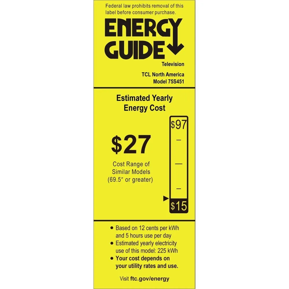 The TCL 75S451 is a 75-inch LED TV introduced in 2021, designed to deliver 4K Ultra High Definition (UHD) resolution with 3840 x 2160 pixels for crystal-clear picture quality. It employs a direct-lit LED backlight panel to provide consistent brightness and color accuracy across the screen. The display supports HDR10+ technology standards, enhancing contrast and delivering vibrant HDR content. Powered by TCL's custom operating system with built-in Roku functionality, it offers a wide range of streaming apps and user-friendly menu navigation. Connectivity options include multiple HDMI 2.0 ports, USB inputs, and support for Wi-Fi and Ethernet, allowing versatile multimedia integration. Audio output is enhanced by Dolby Audio and DTS Studio Sound, designed to provide immersive sound performance for home entertainment environments.