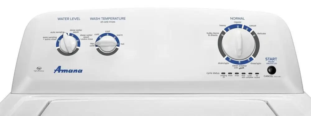 The Amana NTW4516FW is a top-loading washing machine designed to deliver dependable cleaning performance with user-friendly controls.