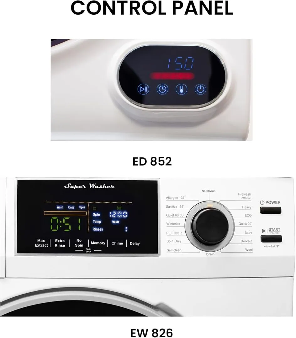 The EW826 washer supports up to 7 kg of laundry per cycle, while the ED 852 dryer accommodates up to 5 kg per drying cycle.