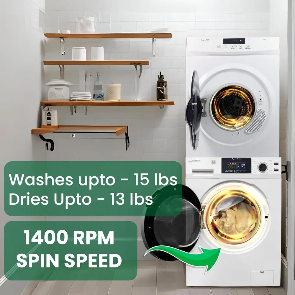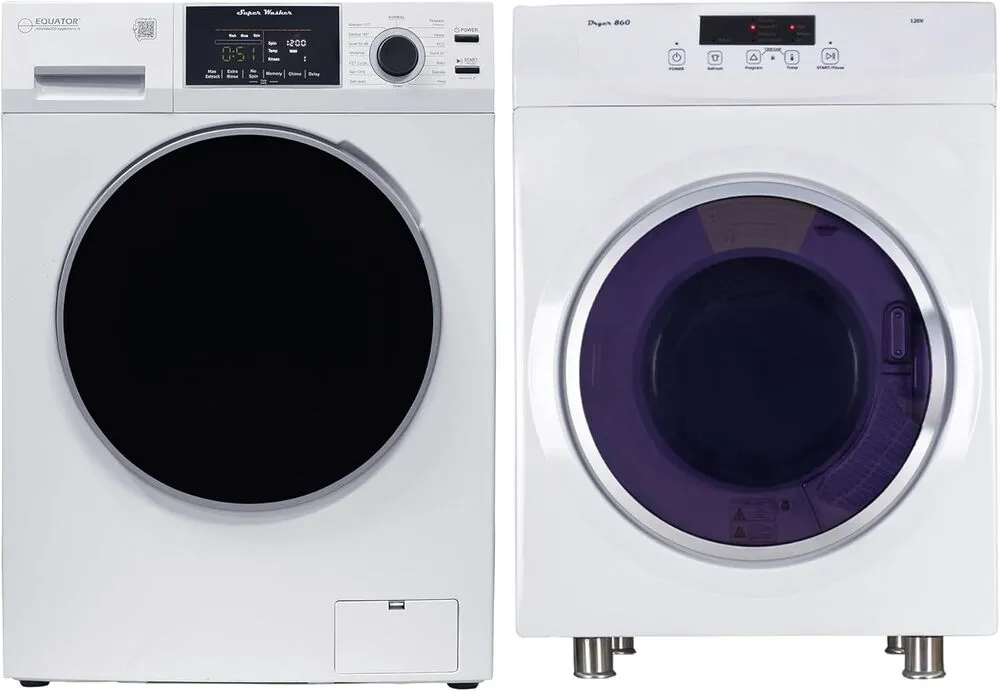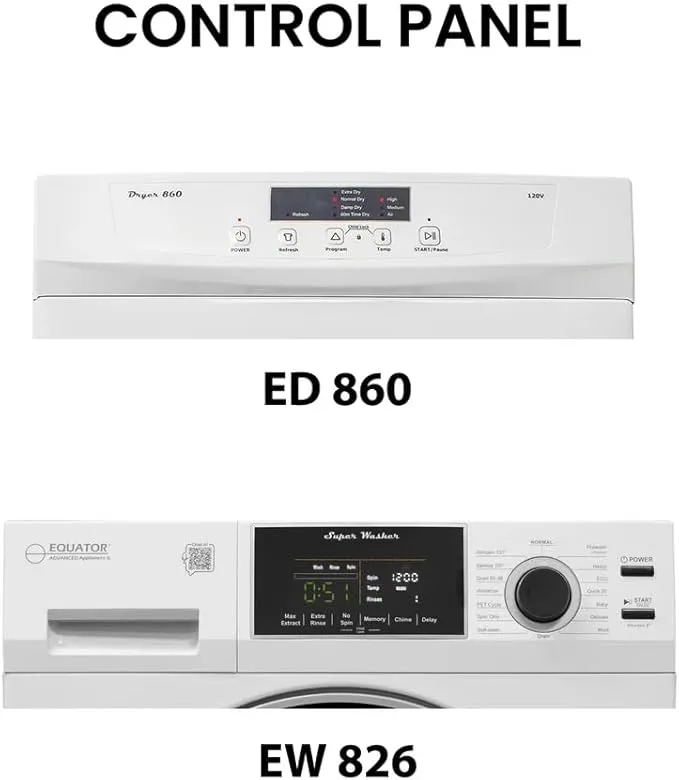 The Equator EW 826 + ED 860 is an innovative washer and dryer combo designed for compact spaces and efficient laundry management. The washer features a 20 lb capacity with a high-efficiency motor that optimizes water and energy usage. The dryer, ED 860, complements with a 15 lb capacity, utilizing a ventless heat pump system to conserve energy and enable flexible installation. Both units support multiple wash and dry cycles, controlled via an intuitive electronic interface with LED display. Advanced moisture sensors in the dryer adjust drying time dynamically, preventing over-drying and maintaining fabric integrity.