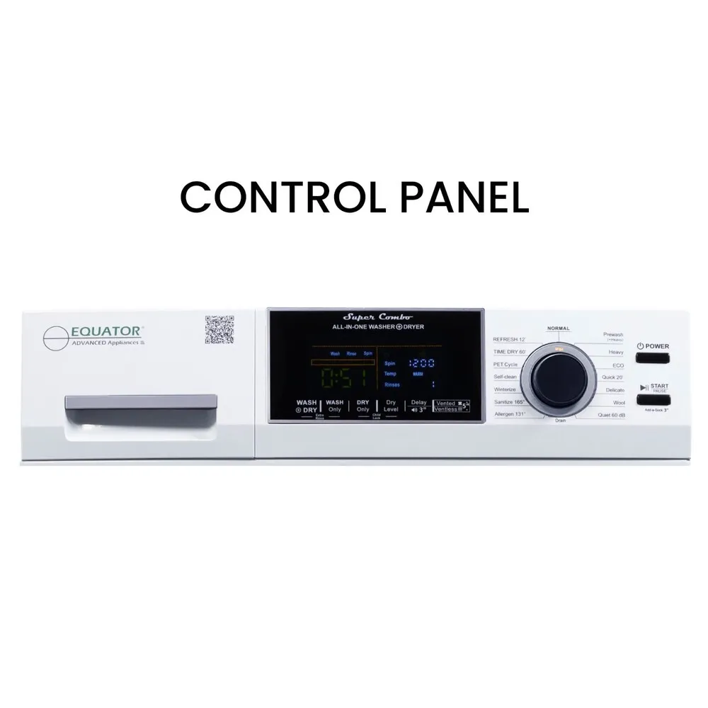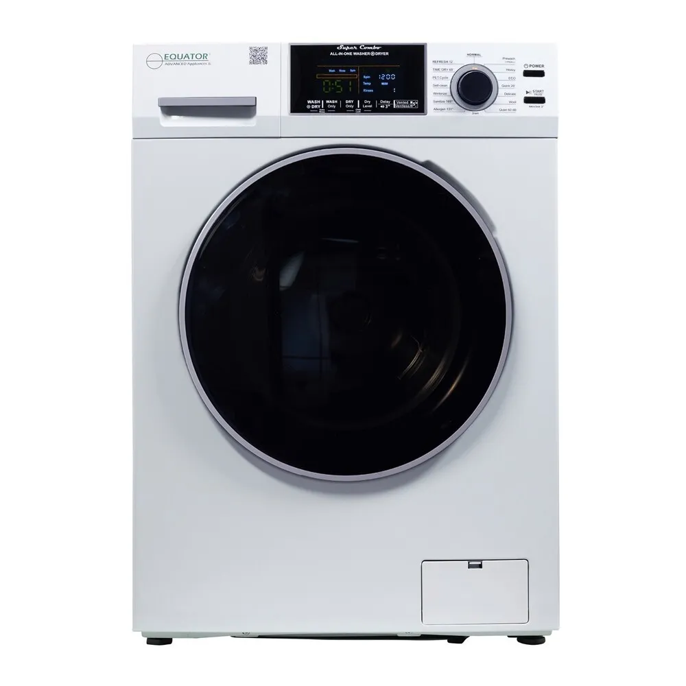 The Equator EZ 4600 W is a compact washer dryer combo designed for space-saving laundry solutions in apartments and smaller homes. It employs a direct drive motor system, which enhances durability and reduces vibration noise during operation. The unit supports multiple wash and dry cycles, optimized for various fabric types and soil levels, utilizing a sensor-based moisture detection technology for efficient drying. It features a rotating drum with a stainless steel interior, promoting long-lasting use and effective cleaning performance. The machine offers electronic controls with a digital display for easy cycle selection and monitoring. Additionally, the unit integrates water and energy-saving mechanisms to reduce consumption while maintaining wash quality.