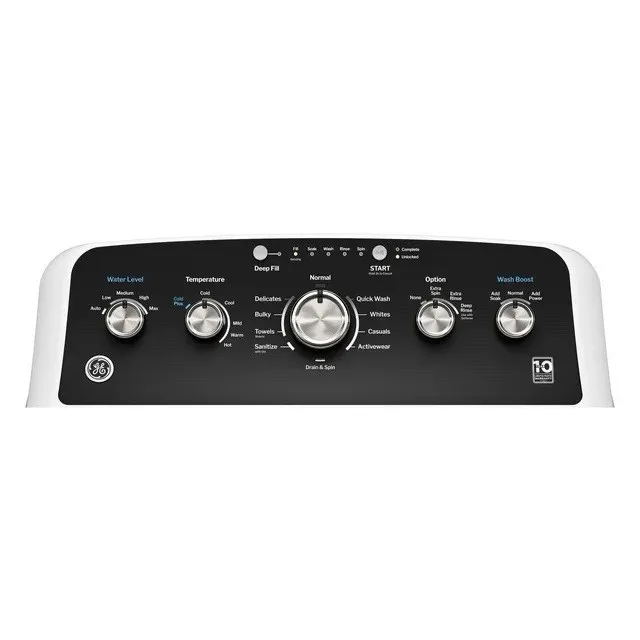 The GE GTW485ASWWB is a top-load washing machine designed with a 4.8 cubic feet capacity, enabling it to accommodate large laundry loads efficiently. It incorporates stainless steel impeller technology that ensures a thorough yet gentle cleaning process while minimizing fabric wear. The washer offers 12 wash cycles, including options such as Heavy Duty, Delicates, and Quick Wash, adapting to various fabric types and soil levels. Its robust wash action combines deep water jets and impeller motions to optimize detergent performance and soil removal. The unit features a high-efficiency motor that balances performance with reduced noise and vibration. Additionally, it includes electronic controls with LED indicators for cycle status and customization of wash options.