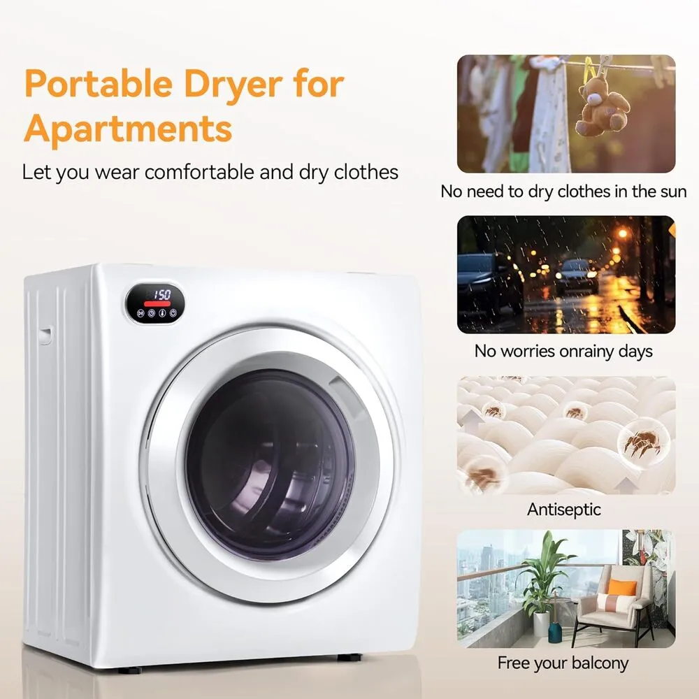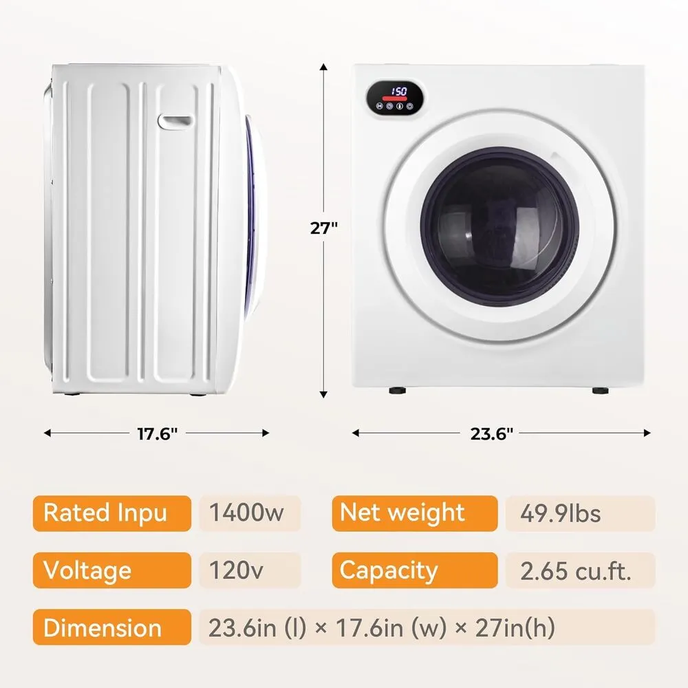 The unit features multiple drying cycles including delicate, permanent press, timed dry, and heavy duty, controlled via an electronic interface for user-friendly operation.