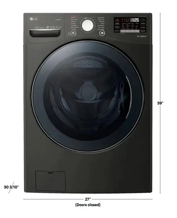 The washer dimensions are approximately 27 inches in width, 38.75 inches in height, and 31.25 inches in depth.