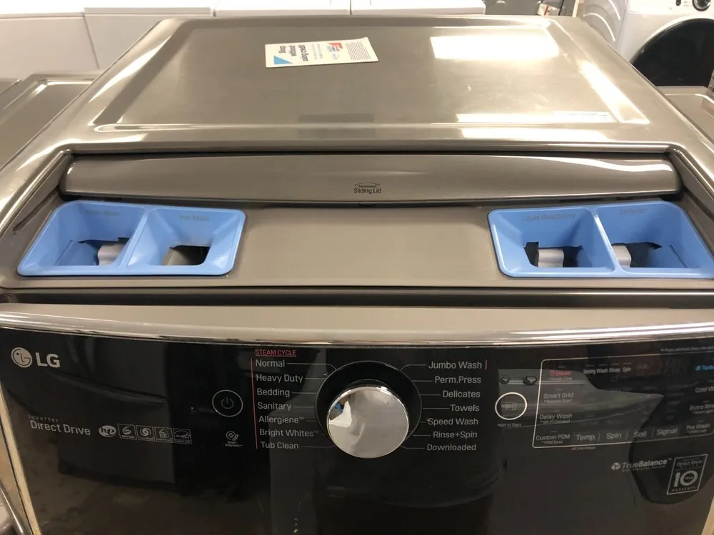 It features inverter direct drive motor technology, TurboWash, and steam cleaning to enhance washing efficiency and stain removal.
