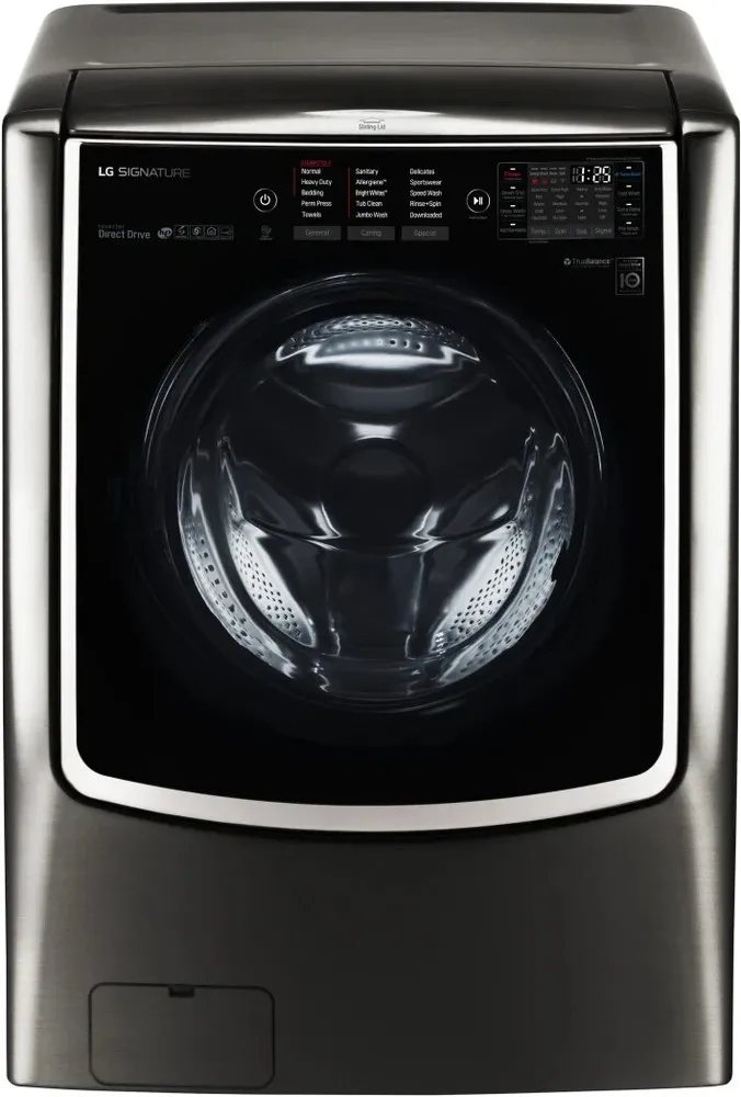 The LG WM9500HKA is a high-efficiency front load washer with a large capacity of approximately 5.0 cubic feet, designed for residential use. It utilizes LG's TurboWash technology which enhances wash performance by reducing cycle times with high-pressure nozzles that thoroughly saturate clothes. The washer features a Direct Drive motor design that reduces vibrations and noise levels while improving durability and reliability through fewer moving parts. It supports steam cleaning technology to tackle stains and sanitize fabrics effectively. The machine is equipped with SmartThinQ connectivity, allowing remote control and monitoring via smartphone apps. Advanced sensors automatically adjust water level, wash time, and detergent usage to optimize efficiency and fabric care.