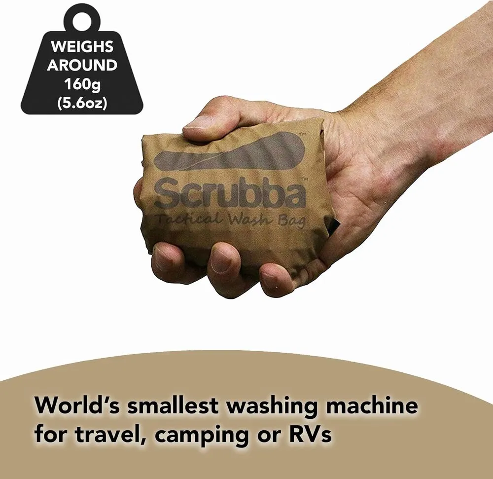 The Scrubba Tactical Portable Wash Bag & Dry Kit is engineered for portable laundry, integrating a flexible wash bag with an internal washboard to enable washing clothes anywhere.