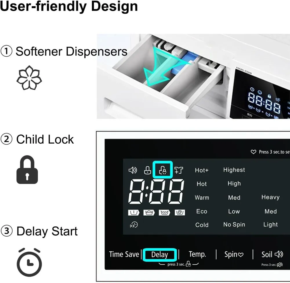 Special Features | Child Lock, Compact,Softener Dispenser,LED Display,High Efficiency,End Of Cycle Signal,Adjustable Shoe,Easy to Install,Front Load,Space Saving, Delay Start, Drum Clean, Time Remaining Display |