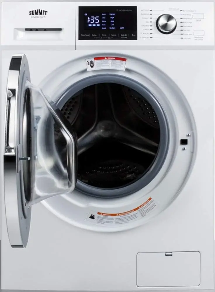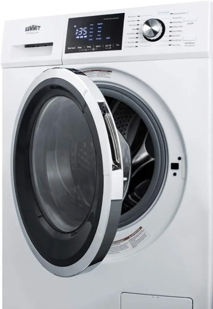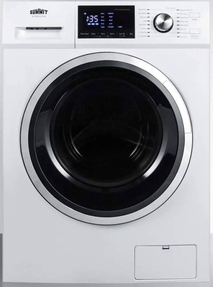 The Summit Appliance SPWD2202W model is a space-saving portable washer-dryer combo designed for small living spaces and apartments. It combines washing and drying functions into a single appliance with a 2.0 cubic feet drum capacity. This unit operates with a wash cycle capacity of approximately 13 pounds and a drying capacity of 8 pounds, suited for small laundry loads. The unit offers twelve wash programs and four drying cycles controlled via electronic touch-pad controls with an LED display for ease of use. It connects to standard water inlets and drains and is equipped with an automatic water level sensor that optimizes water usage based on load size. The SPWD2202W runs with an energy-efficient motor and quiet operation, making it ideal for indoor use in noise-sensitive environments.