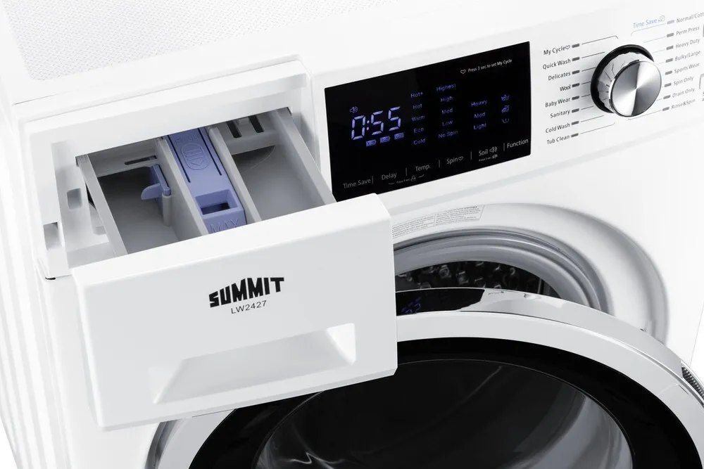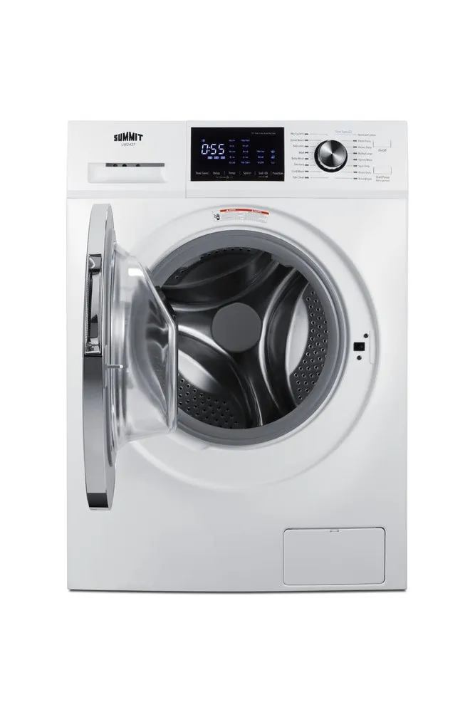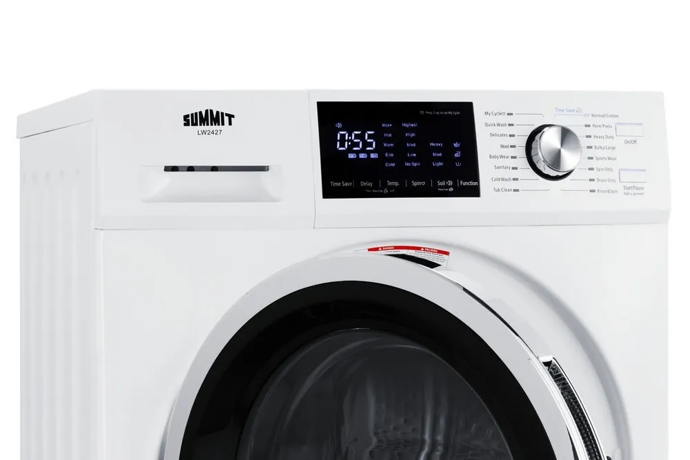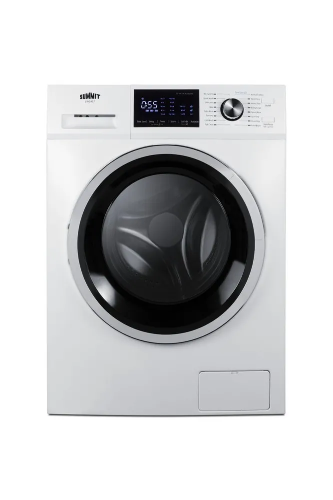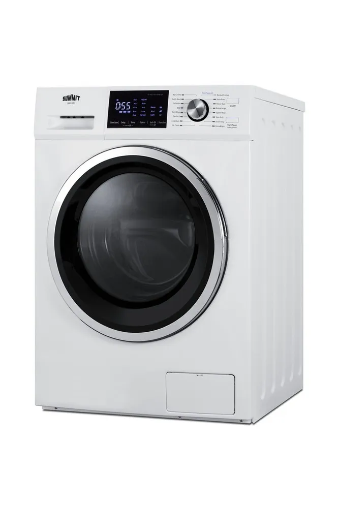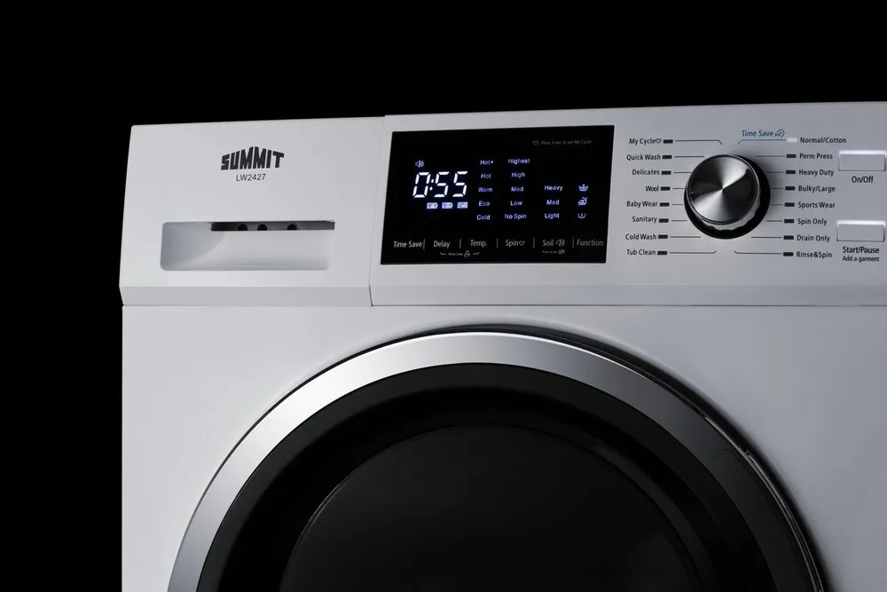 The Summit LW2427 is a compact washer-dryer combo designed for efficient laundry in small spaces. It integrates both washing and drying functions into a single appliance with a 2.4 cubic foot capacity, supporting load sizes typical for apartments and dorm rooms. The unit operates with multiple wash and dry cycles providing flexibility for different fabric types and cleaning needs. Technically, it employs a front-loading mechanism with electronic controls allowing precise cycle customization. It uses electrical heating for drying, which is energy-efficient and safe for delicate garments. Installation requires standard 120V power and a water hookup, optimized for quick setup in limited spaces.
