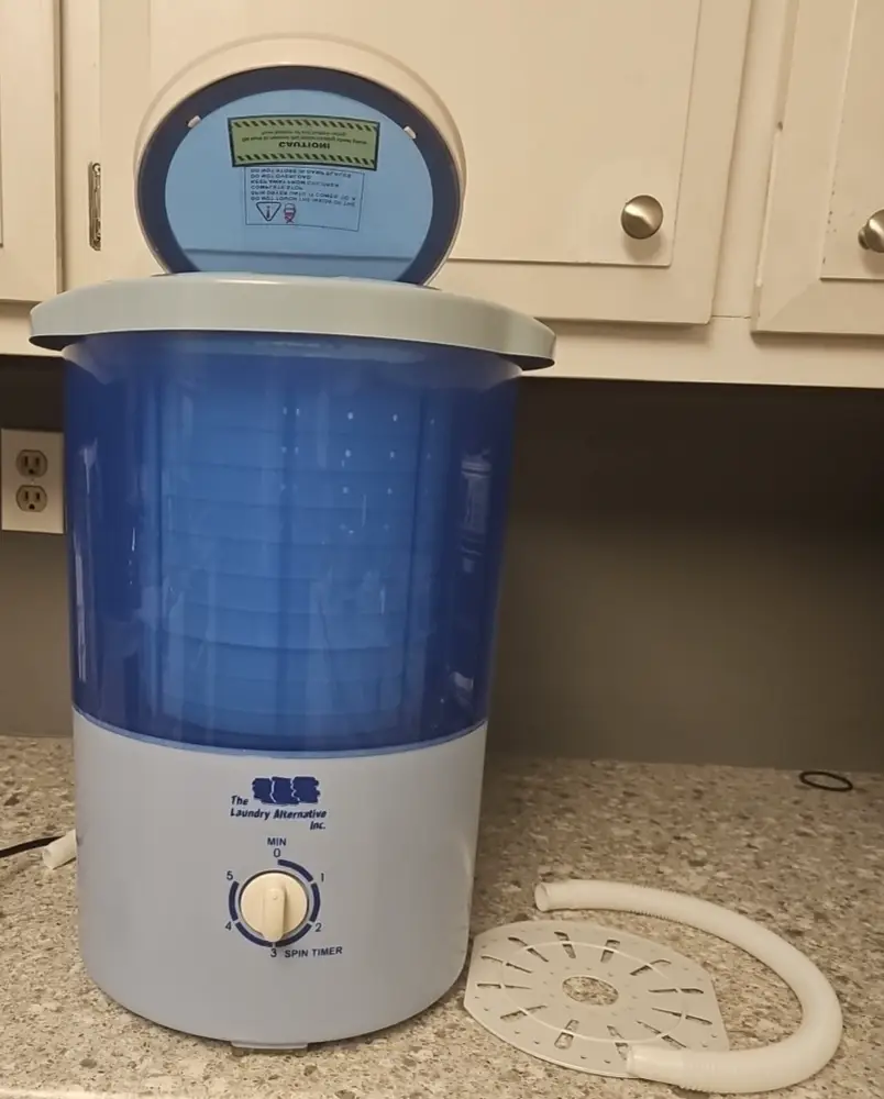The Laundry Alternative T10-04 is an innovative compact washer and dryer device designed for energy and water efficiency. It utilizes a unique manual hand-crank system combined with a high-spinning mechanism to wash and dry laundry without electricity. This model incorporates a 3-speed hand crank and a high-RPM spin feature to extract water effectively, reducing drying time.