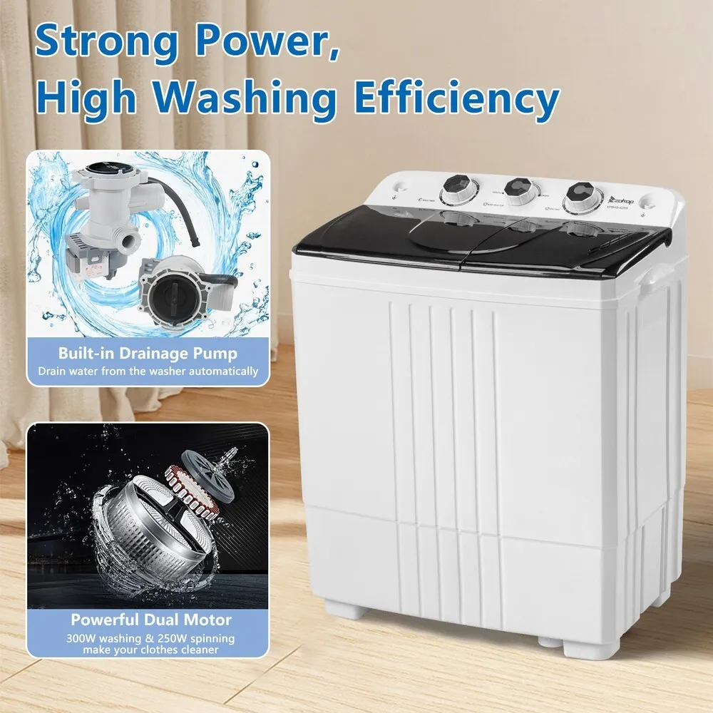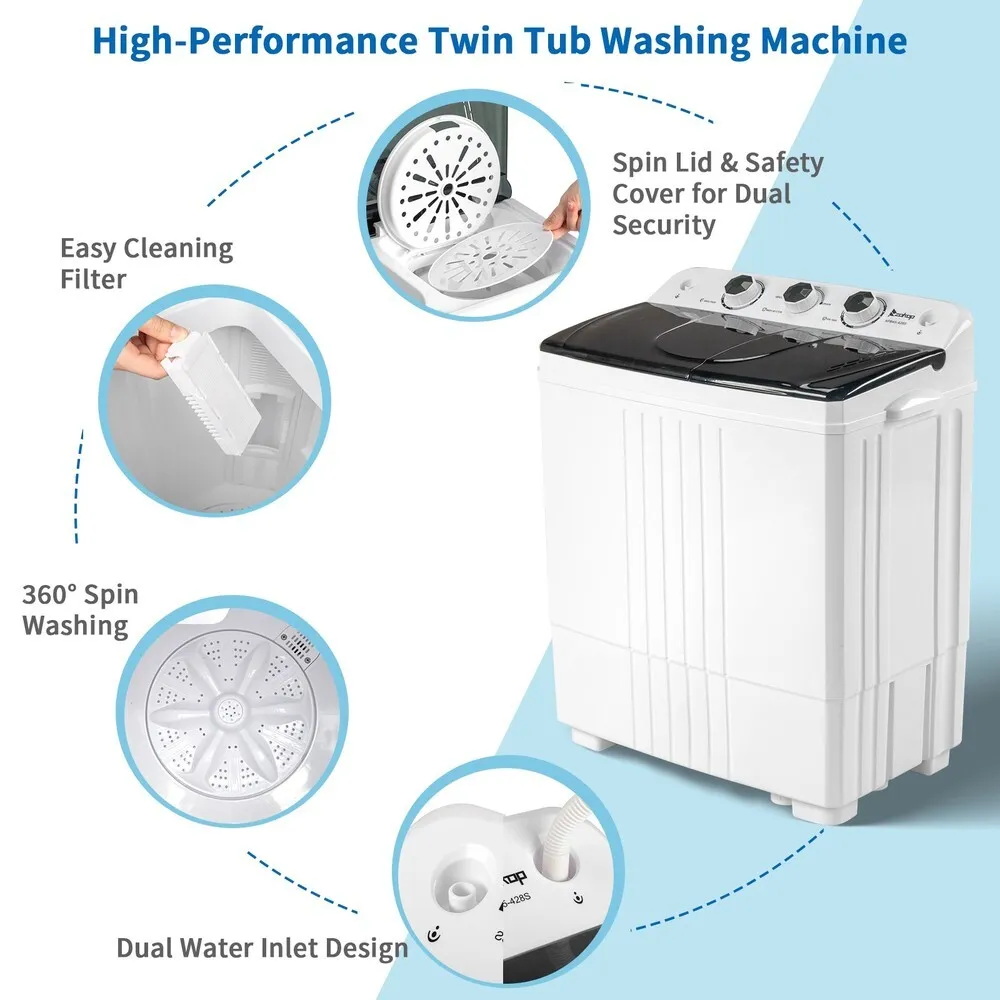 The twin-tub design features one tub for washing clothes and another for spin drying, allowing simultaneous operation.