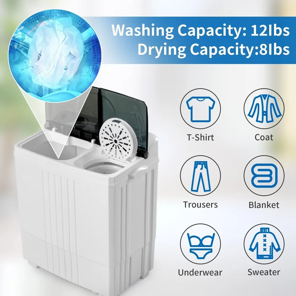 The Unbranded XPB45-428S is a compact mini portable washing machine primarily designed for small load laundry needs. It features a twin-tub design; one tub operates as a washer, the other as a spinner for drying clothes. The washing tub is capable of handling small quantities of clothes, making it ideal for apartments or travel use. It utilizes an electric motor with a wash timer and spin timer that can be manually adjusted up to 15 minutes each. The unit operates on 110-120V or 220-240V, depending on the market, with power consumption roughly around 170 watts. This appliance offers a simple and mechanical operation without advanced electronic controls, emphasizing portability and ease of use.