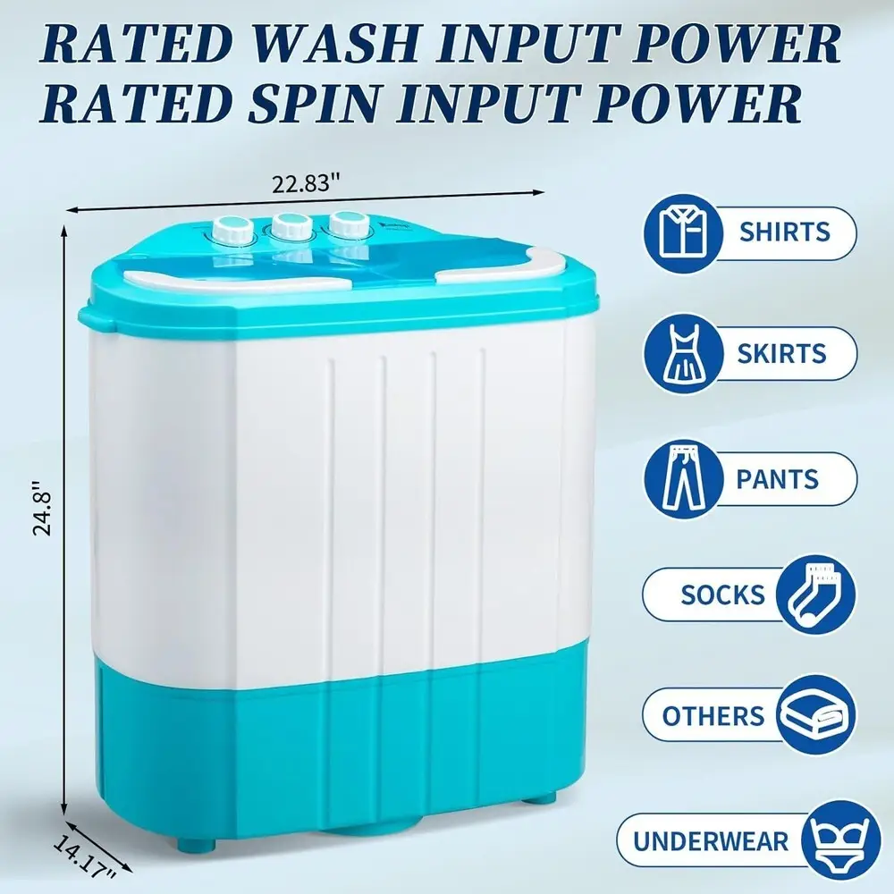 Construction-wise, the outer body is made of durable plastic to reduce weight while providing sufficient structural support. The machine's motor operates at around 280W with a washing frequency optimized for small loads. It also includes a lid lock safety feature to prevent operation when the lid is open, enhancing user safety during use.