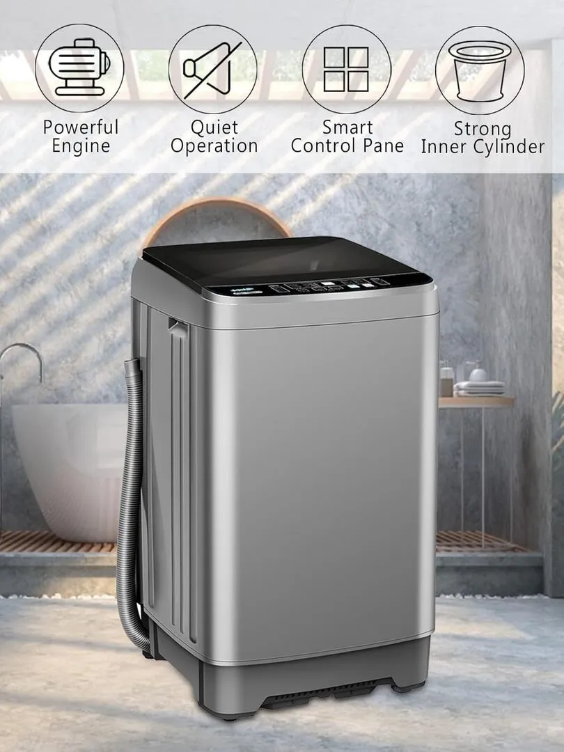The washer features an inverter motor, which is designed to be energy efficient, reducing electricity consumption and operating quietly.