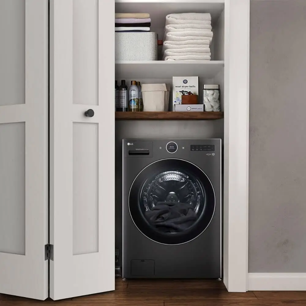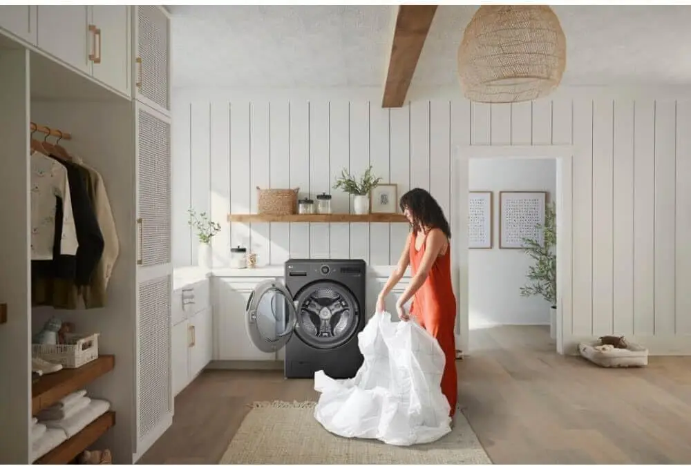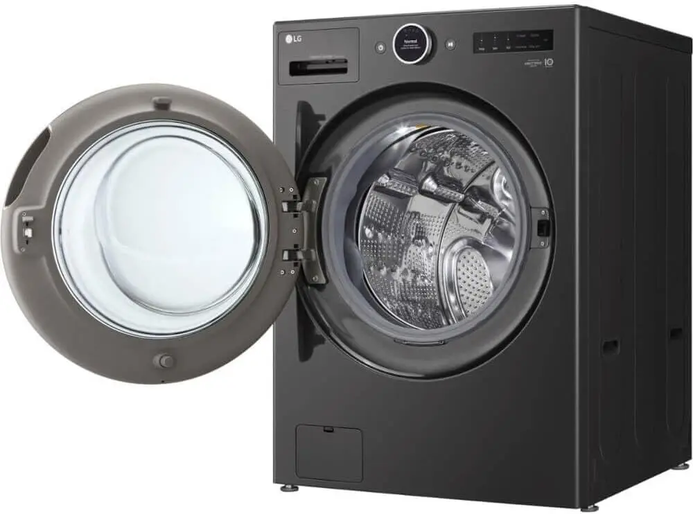 The LG WM6998HBA washer has a large capacity drum designed to handle bulky laundry loads efficiently.