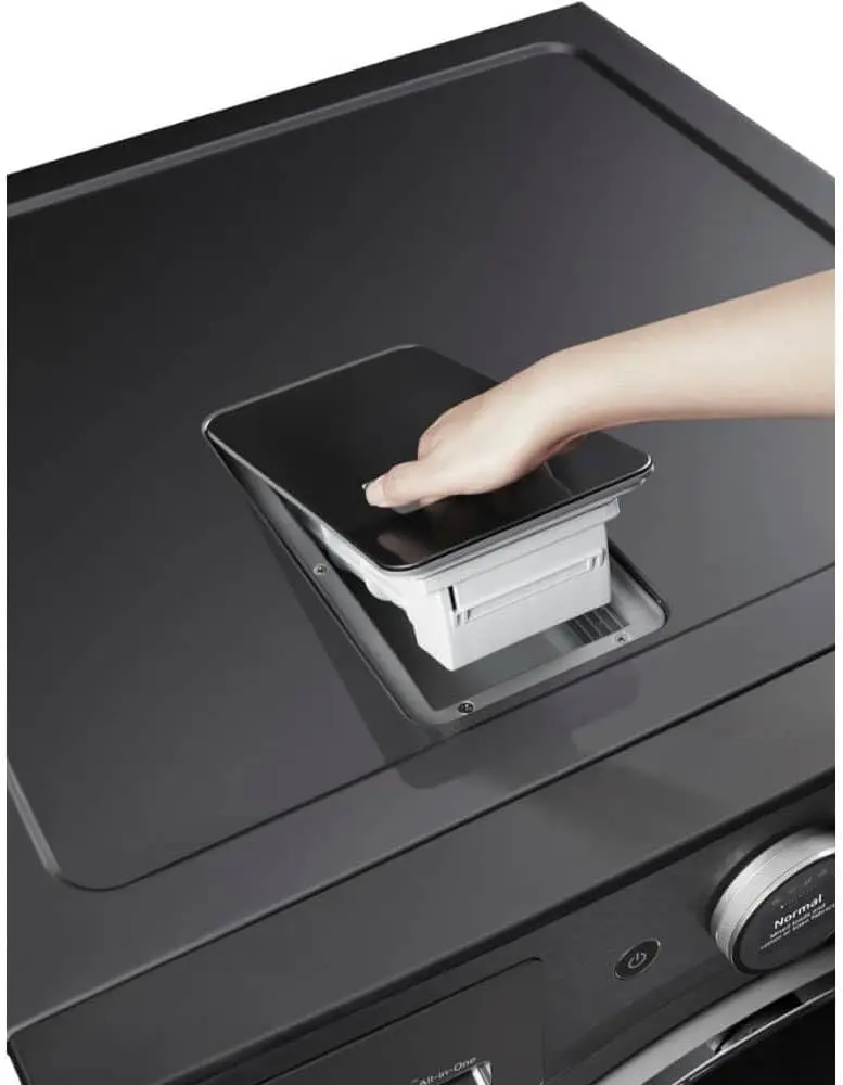 The washer features TurboWash technology which reduces wash times while maintaining thorough cleaning.