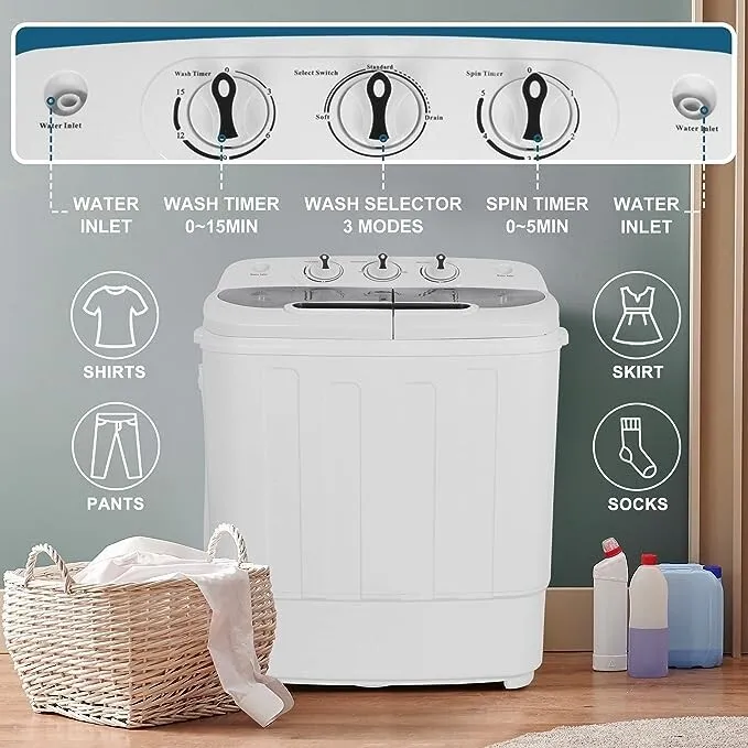 The SUPER DEAL Mini Washing Machine gsd-H01-1363A is engineered as a compact and portable washing solution, ideal for small loads, apartments, and travel. It features a direct-drive motor system designed to reduce noise and improve energy efficiency. Its compact tub capacity supports lightweight fabrics and quick washing cycles. Control options include manual dial knobs for wash and spin settings, allowing for user-friendly operation. The machine is equipped with a sturdy plastic body intended for durability and ease of maintenance. Additionally, it operates at standard voltage levels ensuring compatibility for home use.