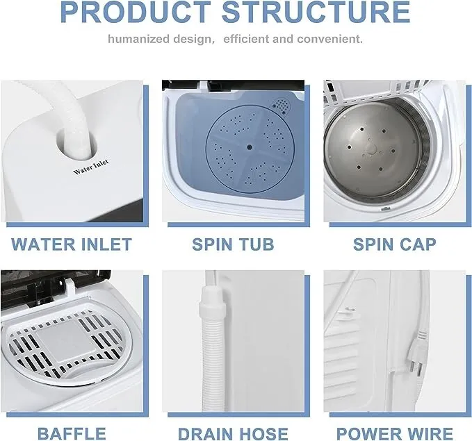 The mini washing machine offers portability and space-saving design perfect for limited space environments. Its low water and power consumption align with energy-efficient standards. The direct-drive motor reduces vibrations and noise, ensuring quieter operation. User-friendly manual controls simplify cycle adjustments without the need for digital interfaces. The washer supports multiple wash and spin cycle options to accommodate different fabric needs. Its lightweight build makes it convenient for transport and setup in various locations.